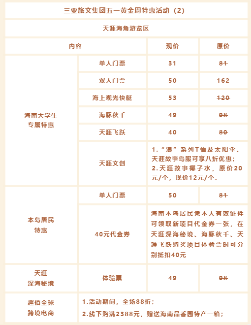 上一篇:三亚旅文集团召开“五一”黄金周工作专题部署会 下一篇:五一优惠(上)| 史上最热五一黄金周临近,收下这份优惠,准备出发吧! < 返回列表
