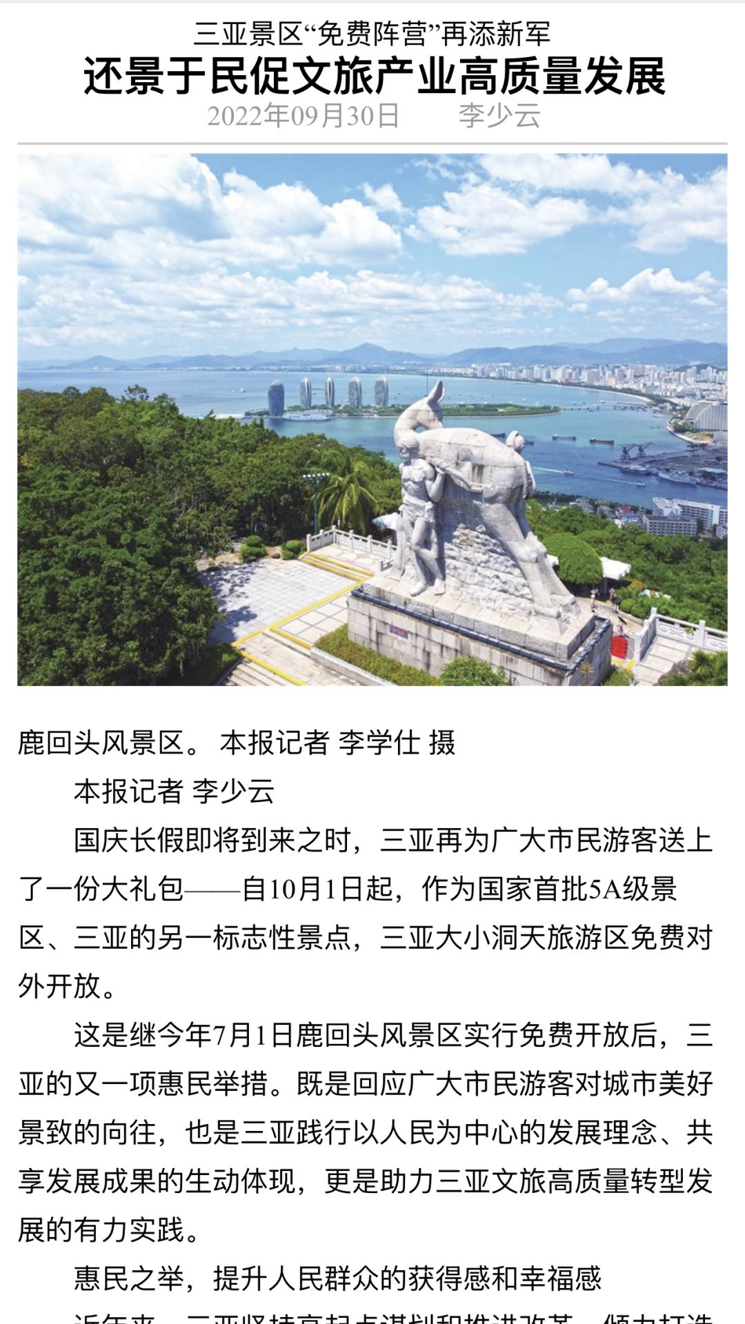 三亚日报多篇报道全方位介绍大小洞天免费开放