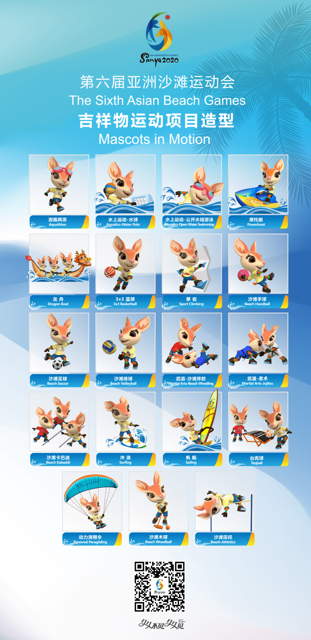 On March 31, the Sixth Asian Beach Games Sanya 2020 (hereinafter shortened as "SABG") Organising Committee released the mascots in motion for the Games. In these images, the mascot Ya Ya is shown playing the 17 sports like an all-round athlete, interpreting the trendy, green, fantastic and magnificent concept of the Games and extending warm invitations to people around the world.