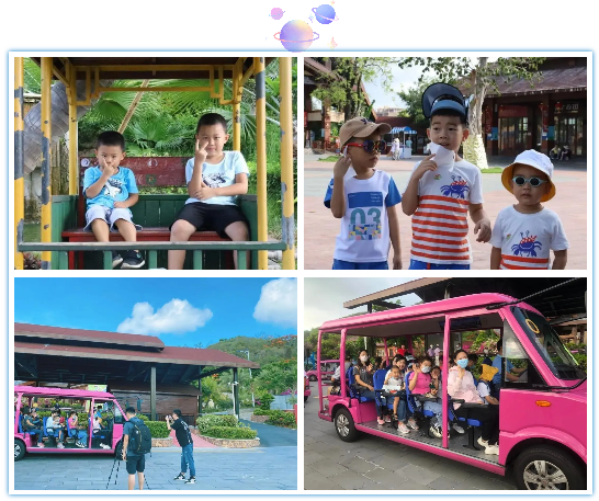 排队坐上鹿回头风景区的粉色观光车,家长和孩子们对着镜头欢快的挥手,鹿回头风景区的探索之旅正式开始。