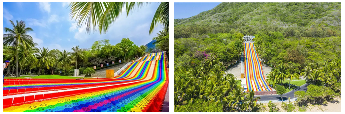 在彩虹滑道现场,3条长达110米的滑道并排呈波浪形,急速穿过绿影婆娑的椰林,不断延伸到海边,滑道整体落差达20米,站在出发点就能让体验者感受面朝大海,出发时便可感受冲向大海的快感,在一阵阵海风从耳旁呼啸而过,乘坐着气垫直冲而下,这种刺激只有亲身体验才能感受得到。从四川成都来旅游的陈小姐在体验彩虹滑道后表示从高处俯冲直下感觉很刺激,玩得很开心。