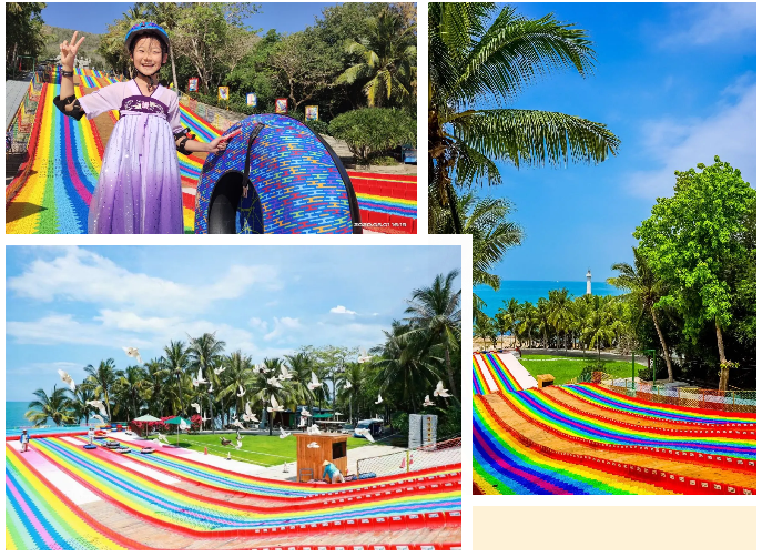 三条长达110米的滑道并排从南山之上不断延伸到南海之滨,宛若彩虹一般。呈波浪形态的滑道整体落差达到了20米,面朝大海,冲刺而下,十分刺激。
