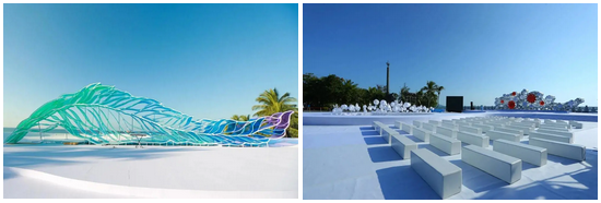 蔡上针对“天涯婚典”的设计中始终坚持“不能用色彩去掩盖自然,不能用设计去替代自然,影响自然的美感”的原则。他说:“在三亚,在天涯海角做设计就像是在一个充满色彩的地方做设计。因此,色彩选择上特别纯净,每一年的设计装置都是通透的,没有视线的阻隔,透过装置可以看到大海,看到天涯海角的一切,在透与不透之间有着独特的反射和韵律感。”