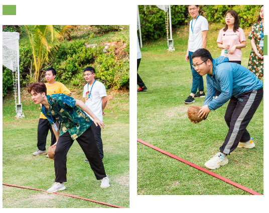 激动人心的椰子保龄球环节,随着主持人讲解规则完毕,两支队伍同时进行比拼,大家互相讨论着怎么才能击倒更多保龄球瓶。