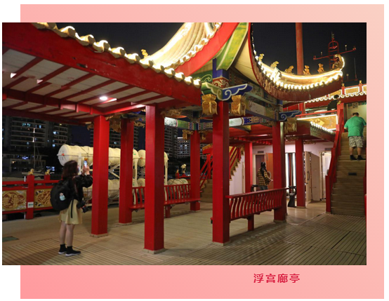拾阶而上,步步登高,雕梁画栋,琼楼玉宇。远眺夜晚平静的海面,如临蓬莱仙宫!