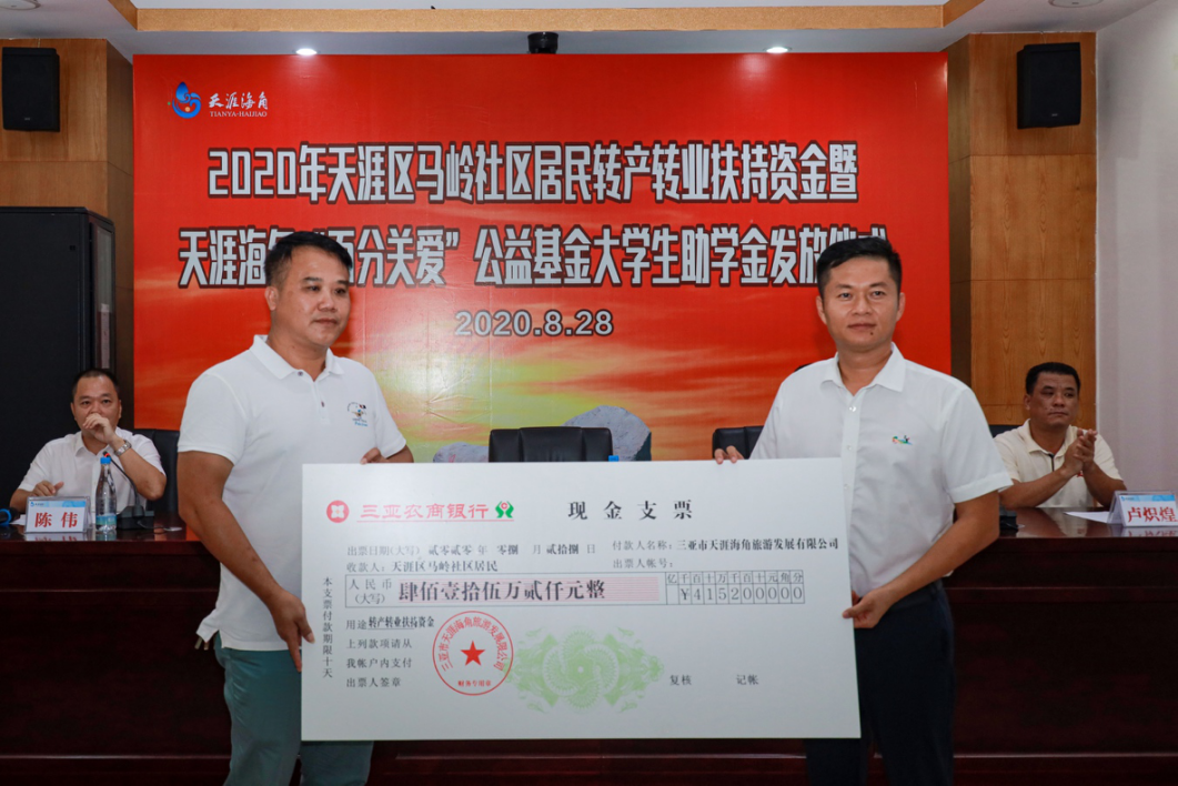 近期,天涯区马岭社区居民转产转业扶持资金暨“百分关爱·天涯海角”公益基金大学生助学金发放仪式在天涯海角游览区举行。仪式现场,三亚市天涯海角旅游开展有限公司(以下简称“天涯海角公司”)向入股三亚天岭海上旅游服务有限公司(以下简称“天岭公司”)的1038户居民发放了第五笔“海上游天涯”转产转业扶持资金共计415.2万元,第六次向马岭社区在校大学生发放助学金共计137万元。受疫情影响,各景区营收锐减,三亚旅文集团及其成员企业仍不忘帮扶和献爱心,履行社会责任,为社区居民给予生活保障,彰显了国企担当。